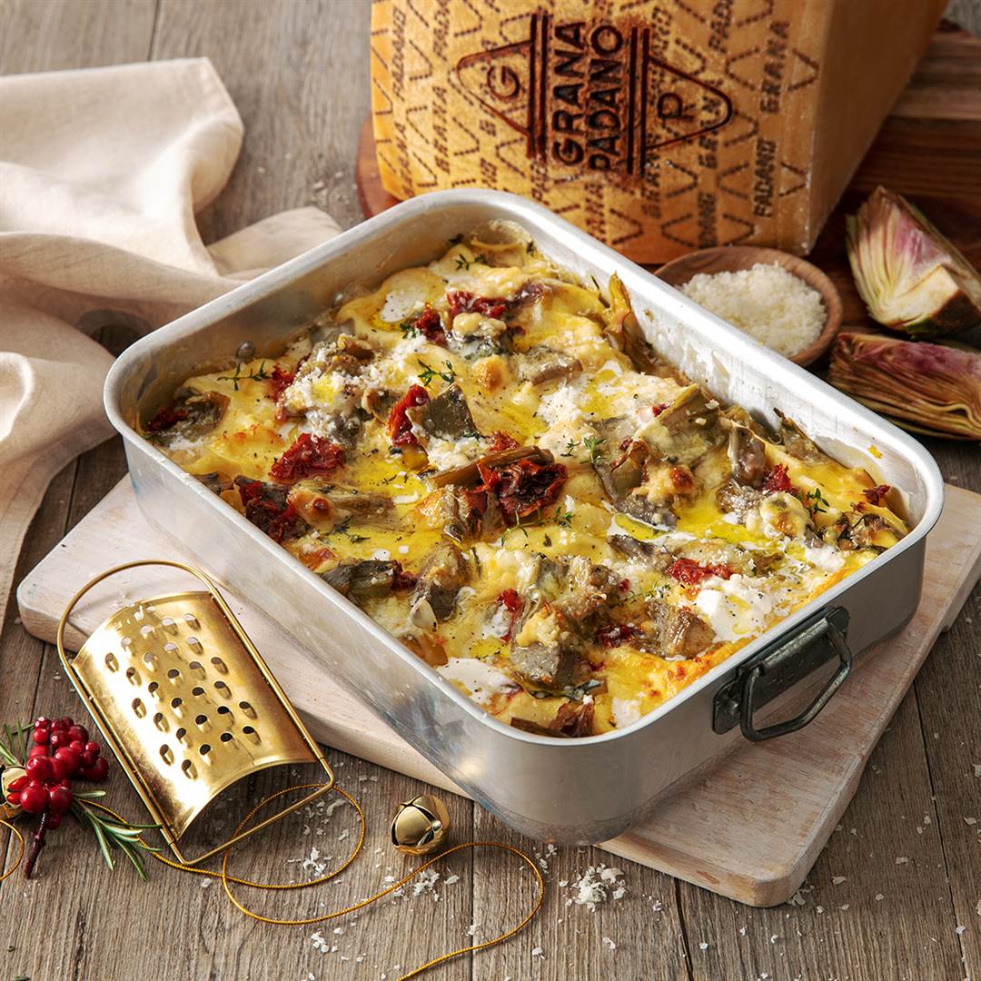 Lasaña blanca con alcachofas, salsa béchamel ligera y Grana Padano