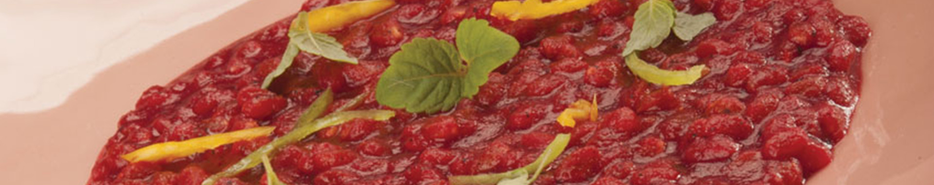 Unire al farro la purea di barbabietola e completare la cottura continuando ad aggiungere il brodo, togliere dal fuoco, mantecare con l’olio all’aglio e peperoncino e il Grana Padano grattugiato.